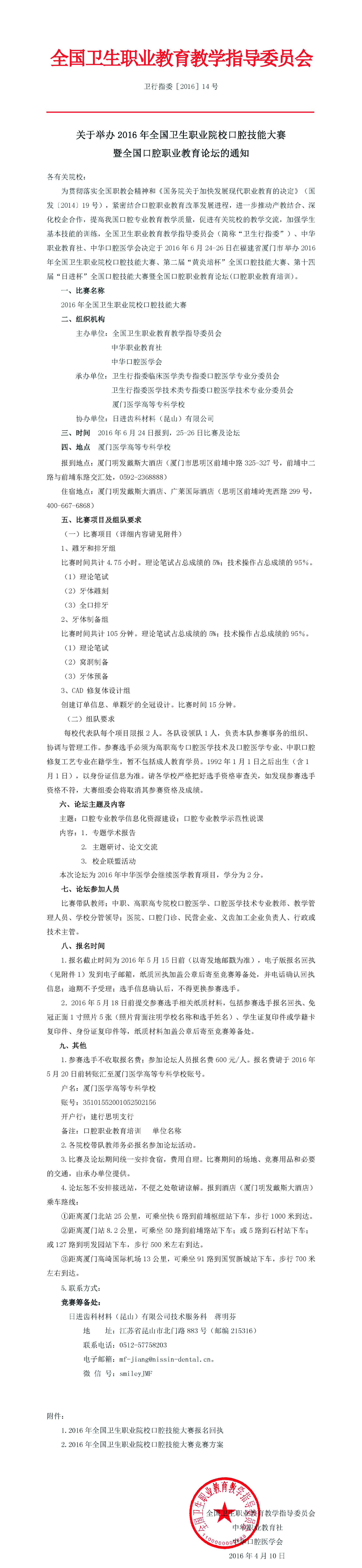 2016年全國衛(wèi)生職業(yè)院校口腔技能大賽、第二屆“黃炎培杯”、第十四屆“日進杯”全國口腔技能大賽暨全國口腔職業(yè)教育論壇通知